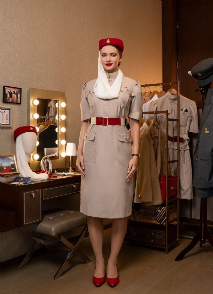 Dois anos depois, o uniforme ganhou novo corte e detalhes dourados. A jaqueta bege trespassada, os botões dourados e o véu branco sobre o chapéu vermelho reforçaram a identidade luxuosa da companhia. O dourado, escolhido por simbolizar o brilho de Dubai, tornou-se um elemento permanente do DNA da marca.