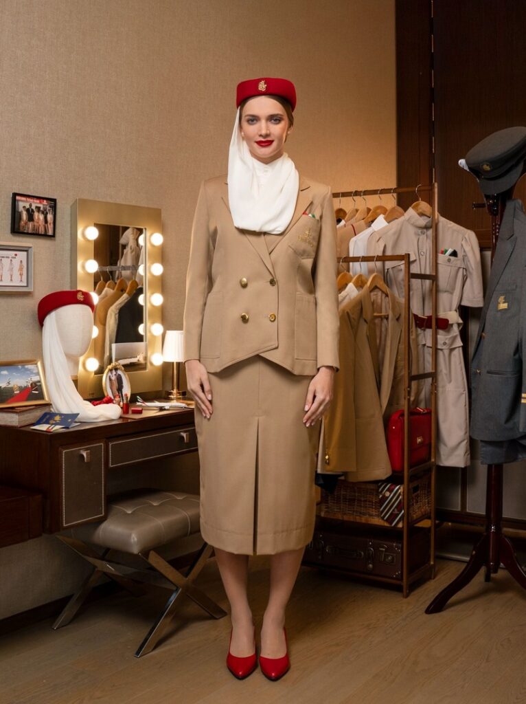 Com a chegada do lendário Airbus A380, o maior avião de passageiros do mundo, a Emirates apresentou uma nova versão de seu uniforme. Mantendo o bege e o vermelho, o design ganhou riscas de giz sutis, pregas que revelam o tom vermelho icônico e detalhes refinados em todo o conjunto.