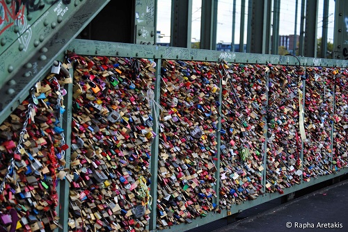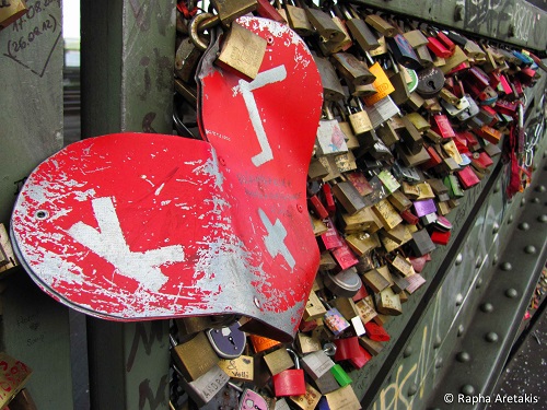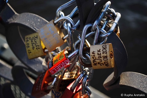 A cada dia que passa viajantes inebriados pelo amor acham as mais diversas formas de mostrar ao mundo os seus sentimentos. Uma delas, talvez a mais difundida (e contagiante), é o ato de pendurar cadeados em pontes. Os modelos de cadeados são os mais diversos. Cores e formatos idem. Geralmente os nomes dos pombinhos ou suas iniciais são gravados no artefato e cabe ao casal escolher o melhor momento/local para a cerimônia. Chegou na ponte desprevenido? Não tem problema! Em Paris, na Pont de L’Archevêché, enquanto fotografava algumas dessas demonstrações de amor, um senhor me abordou e, na boca miúda, tentou me vender um cadeado. Ou seja, só não entra na onda quem não quer.