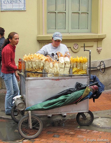 Barraquinha de comida em Bogotá: chips de batata, banana e churros