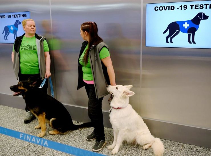 O aeroporto finlandês de Helsinque está usando um método único para rastrear passageiros que chegam para COVID-19 : cães especialmente treinados que podem detectar o vírus..