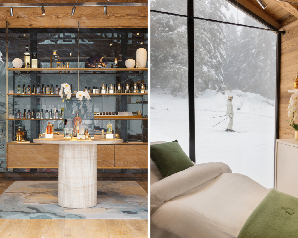Com 35 m², a Ruche Hivernale se divide em dois ambientes complementares. A área da boutique convida os visitantes a descobrir as coleções icônicas da Maison Guerlain – skincare, maquiagem, Haute Parfumerie e criações exclusivas desenvolvidas especialmente para o Cheval Blanc Courchevel – em uma atmosfera íntima, como um elegante apartamento alpino.
