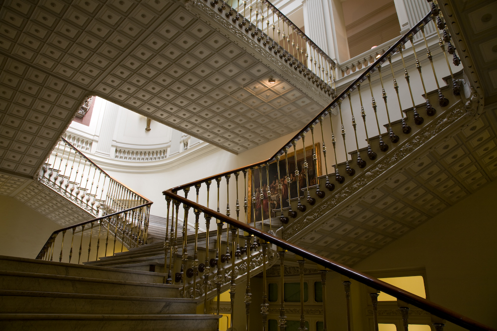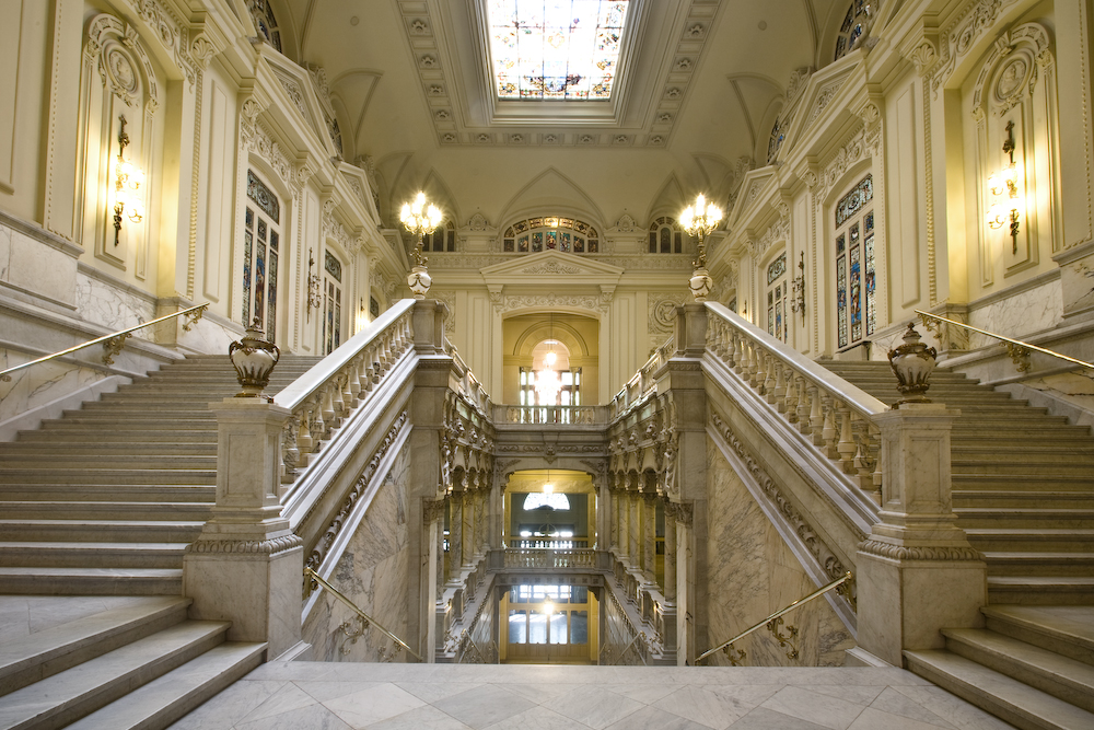 Construído no final do século XIX, o Banco da Espanha impressiona já na entrada. Escadarias de mármore conduzem a salões amplos, vitrais monumentais vindos de Munique filtram a luz natural, lustres de cristal iluminam os ambientes e esculturas celebram prosperidade, trabalho e comércio.
