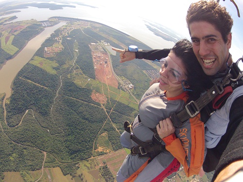Incrível e surpreendente! Assim classifiquei o meu primeiro salto de paraquedas, que aconteceu em Foz do Iguaçu (Paraná), na última quinta-feira (13), realizado pela Skydive Foz. Não que eu seja uma aventureira inveterada, alguém com sede constante por adrenalina ou ávida por situações de risco. Ao contrário, sempre opto por escolhas ponderadas, medidas pensadas, atitudes acertadas… Uma sabedoria covarde que, de certa forma, me fez chegar onde sempre quis. Por isso mesmo, saltar de paraquedas estava lá guardado na minha lista de desejos, como algo a ser realizado um dia talvez… O esporte que exibe uma performance coreografada e colorida no ar, em milhares de pés de altura, não é para qualquer um. Por mais vontade que se tenha, é preciso seguir regras de precaução, ter uma boa dose de coragem para enfrentar, principalmente, a altura e confiança absoluta no instrutor que te leva a um mundo inimaginável. O convite me foi feito pela Skydive Foz, uma empresa séria, com profissionais altamente qualificados e equipamentos de ultíssima geração. Encorajada pelo grupo de jornalistas, que estava comigo, resolvi saltar. Antes, porém, um treinamento rápido com os instrutores da empresa te ensinam o que fazer e como fazer, desde o momento em que o avião sobe, passando pela fatídica hora do salto, até chegar a hora do retorno, em solo. Colocação do macacão e das tiras, posição da barriga, abertura dos braços, flexão das pernas… Tudo, tudo milimetricamente explicado, checado e rechecado… É chegado o momento! No meu caso, fiz o salto duplo como o João Víctor, de 29 anos de idade. Paulista, com quase 1000 saltos no currículo, dez anos de experiência, João é um instrutor calmo, inteligente e que domina a técnica como ninguém.