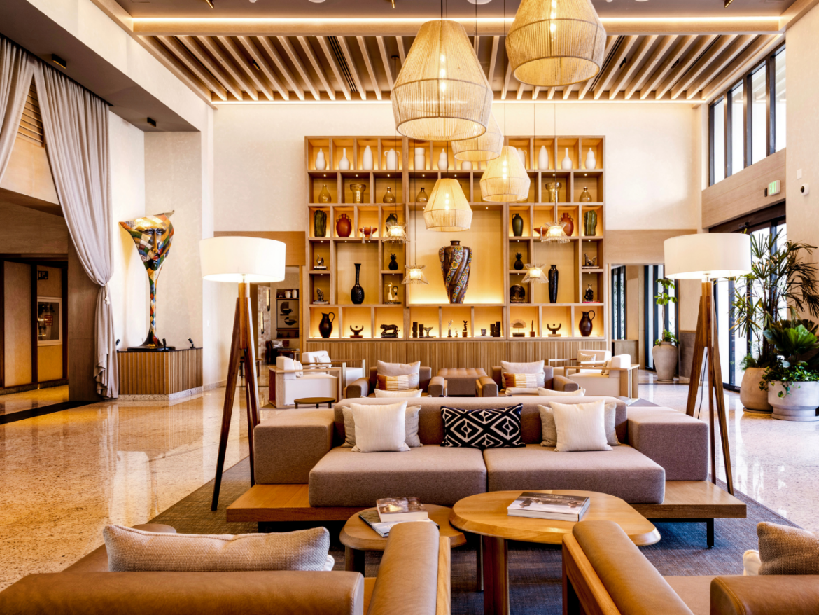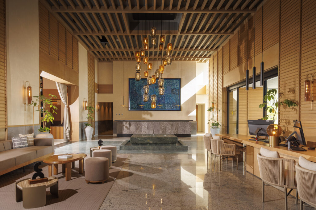 Desde o lobby, banhado pela luz dourada do Pacífico, revela-se um trabalho de curadoria que convida a explorar o local como uma experiência cultural imersiva. A imponente instalação de vidro soprado que domina a entrada estabelece o tom de uma estética atemporal e acolhedora, evocando as paisagens que moldam a Riviera Nayarit. Logo atrás, a obra do mestre wixárika Fidencio Benítez adiciona uma camada espiritual e simbólica: fios ancestrais entrelaçados em tons de verde e azul que remetem ao agave, ao sol e à natureza, elementos que definem a identidade regional.